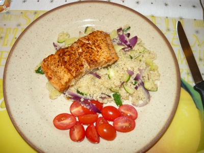 Lososa osolíme a opepříme a vložíme na potřený plech máslenkou a vložíme do trouby na cca 20min. Na pánvi si podusíme červenou cibuli, cuketu a papriku, jemně posolíme. V nádobě si dle návodu připravíme kuskus (80g+160ml vařící vody), poté smícháme podušenou směs cibule, papriky a cukety s kuskusem a na závěr do směsi přimíchám lžičku bodlákového oleje. Servírujeme na talíř.