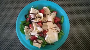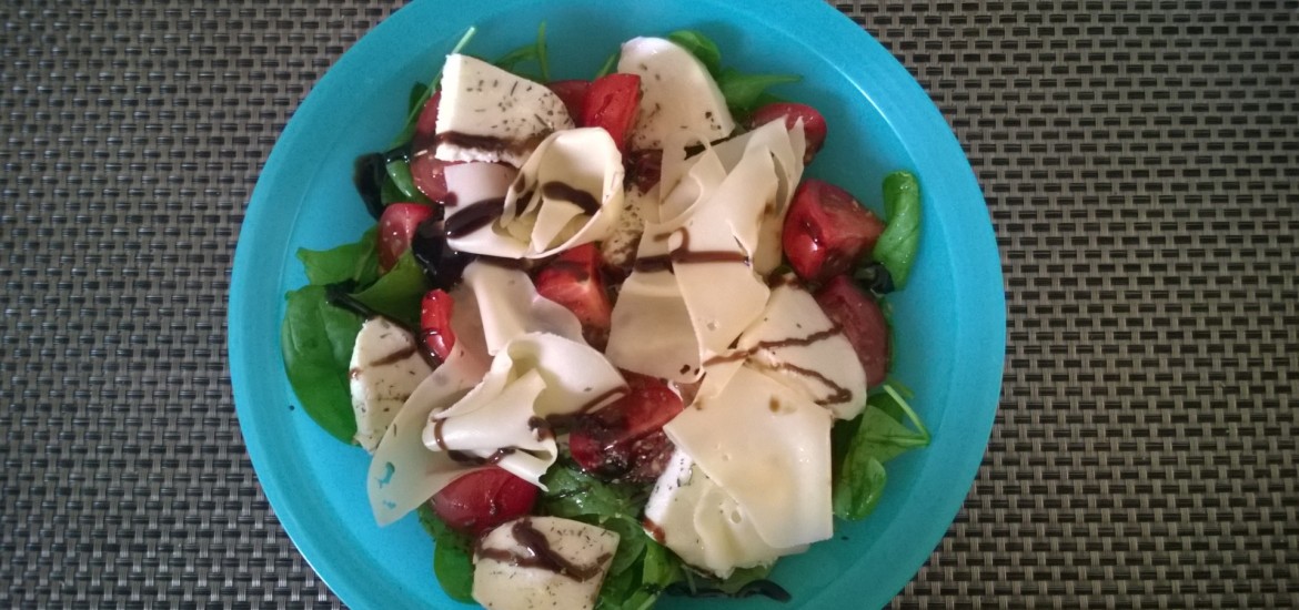 Umyjeme lístky salátu, který dáme do misky, nakrájíme rajčátka, mozzarellu a přidáme k salátu. Pak pokapeme lněným olejem, šťávou z citrónu, balsamicem, agávovým sirupem a posypeme kořením Italy-mix, které neobsahuje sůl. Pak mezi rajčata přidáme tenké plátky ementaleru sýru, posypeme citrónovým pepřem a jemně solí.